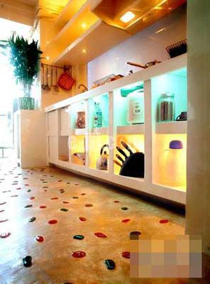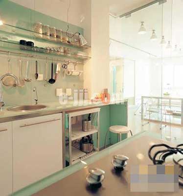 原本極為普通的水泥地面,因?yàn)榍渡狭擞昊ㄊ悴噬袡C(jī)玻璃塊,立即變得活靈活現(xiàn),讓人見(jiàn)之不禁想擺脫鞋襪的束縛,光著腳丫在上面重溫一下海邊嬉戲的快樂(lè)。重新筑建的取代整體櫥柜地位的水泥墻體也毫不遜色,開放式的格局設(shè)計(jì),冷熱光源的區(qū)分,讓存儲(chǔ)柜亦是展示柜,廚房小家電及器具既得到了安身立命之所,又成為狹小空間的裝飾點(diǎn)綴。與其它風(fēng)格相比,“一”字型和“L”型簡(jiǎn)約風(fēng)格的整體櫥柜更加適合這種封閉式的廚房空間。以直線條為主的整體櫥柜,因磨砂玻璃的加盟,有效地實(shí)現(xiàn)了期盼已久的瘦身,從視覺(jué)上為廚房減少了一些擁擠感,并為不甘寂寞的早餐桌騰出一席之地;絢麗的櫥柜飾面,不但可以激起人的食欲,在縱橫馳騁于白色瓷磚間的同色調(diào)的勾線和窗簾的配合下,徹底消除了沉悶的封閉氣氛。