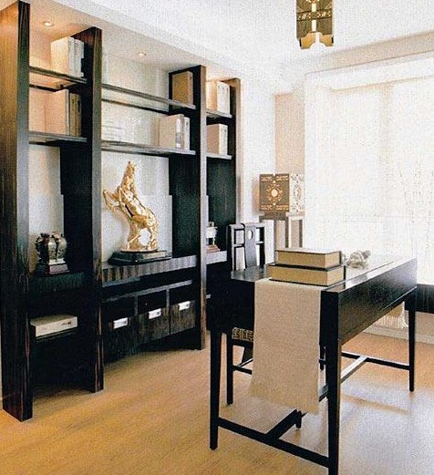空間布局:書房的布局要盡可能地“雅”。在您的書房中,不要只是一組大書柜,加一張大寫字臺、一把椅子,您要把您的情趣充分融入您書房的裝飾中,一只藝術收藏品、幾幅您鐘愛的繪畫或照片、幾幅您親手寫就的墨寶,哪怕是幾個古樸簡單的工藝品,都可以為您書房增添幾分淡雅、幾分清新。