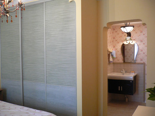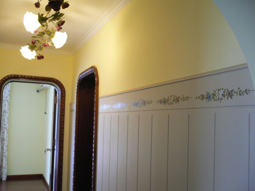 ②走廊護(hù)墻裙上貼的水移畫:其花朵圖案與頂上花朵形狀的吸頂燈交相呼應(yīng)表達(dá)了一種向往自然、田園的感覺。