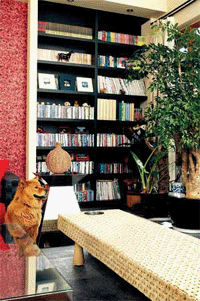 充分利用空間是選擇和搭配家具的首要目的。在此書房空間內(nèi),業(yè)主靠墻設(shè)置從上到下的大書柜,滿足藏書的需求。中間則放置了一張造型簡單的藤質(zhì)矮腳長桌。再配以色彩、造型都很簡潔的黑色沙發(fā)、玻璃茶幾等,在滿足實用的閱讀休閑需求的同時顯示了主人的性格愛好。