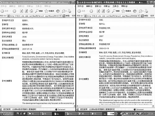 發(fā)帖人小蕭所指的“史上最牛碩士論文抄襲”,是東北財(cái)經(jīng)大學(xué)2007年的一篇碩士學(xué)位論文。這篇被指“抄襲”的論文題為《山東省FEEEP協(xié)調(diào)度研究》:“作者:袁×;指導(dǎo)教師:楊××教授;答辯日期:2007年11月;網(wǎng)絡(luò)出版投稿時(shí)間:2008年3月19日”。而被抄襲的對(duì)象是南京財(cái)經(jīng)大學(xué)2006年的一篇碩士學(xué)位論文:“《江蘇省FEEEP協(xié)調(diào)度研究》,作者:曾××;指導(dǎo)教師:胡××教授;答辯日期:2006年12月27日;網(wǎng)絡(luò)出版投稿時(shí)間: 2007年7月16日?!?