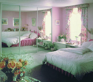 在睡房?jī)?nèi),鏡子宜鑲嵌在衣柜里,因梳妝臺(tái)上方鑲有鏡子,因此梳妝臺(tái)不宜向床。有些人有半夜起床的習(xí)慣,為防止突然見(jiàn)到鏡中自己的影像被嚇,應(yīng)在睡房鏡子上裝布簾,睡覺(jué)時(shí)拉上布簾將鏡子遮住。