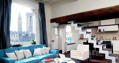 客廳內(nèi)大面積的窗戶,讓陽(yáng)光暢通無(wú)阻。同時(shí)將街景以及佛羅倫薩幾百年的老建筑像畫(huà)一樣呈現(xiàn)在公寓內(nèi)。加上開(kāi)敞式的設(shè)計(jì),使得整個(gè)公寓一層顯得非常寬敞和舒適。