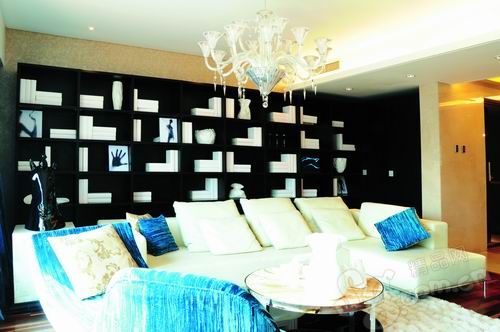 5.客廳的超大書柜成為了最好看的背景,把書按照這種形式擺放只是為了達(dá)到一種裝飾效果,和點(diǎn)綴在書柜上的那些相框異曲同工。白色的沙發(fā)、白色的地毯顯得有些單調(diào),但有了旁邊的藍(lán)色絲絨貴妃榻,那就是一番別樣的雅致了。這樣設(shè)計(jì)也使花花的地板不顯得突出了。