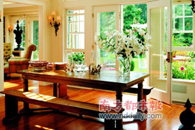 客廳具有多種功能:它既是全家活動、娛樂、休閑、交流等活動場所,又是接待客人的社交空間。有的住宅客廳空間比較大,還具有就餐、學(xué)習(xí)的功能??蛷d是家居生活的中心地帶,使用頻率非常高,各種功能用起來是否方便,直接影響到主人的生活??蛷d要實用,就必須根據(jù)自己的需要,進行合理的功能分區(qū)。如果家人看電視的時間非常多,那么就可以視聽柜為客廳中心,來確定沙發(fā)的位置和走向;如果不常看電視,客人又多,則完全可以會客區(qū)做為客廳的中心??蛷d區(qū)域劃分可以采用"硬性區(qū)分"和"軟性劃分"兩種辦法。軟性劃分是用"暗示法"塑造空間,利用不同裝修材料、裝飾手法、特色家具、燈光造型等來劃分。如通過吊頂從上部空間將會客區(qū)與就餐區(qū)劃分開來,地面上也可以通過局部鋪地毯等手段把不同的區(qū)域劃分開來。家具的陳設(shè)方式可以分為兩類--規(guī)則(對稱)式和自由式。小空間的家具布置宜以集中為主,大空間則以分散為主。硬性劃分是把空間分成相對封閉的幾個區(qū)域來實現(xiàn)不同的功能。主要是通過隔斷、家具的設(shè)置,從大空間中獨立出一些小空間來。