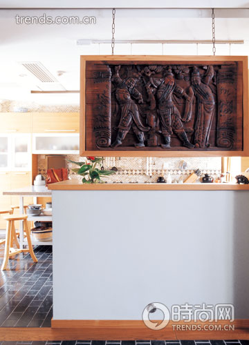 概要: 懸吊在廚房開放式窗口重鑲了邊框的“劉、關(guān)、張”木雕,是客人入門后的第一個驚喜看點(diǎn)。 李慧的家,正應(yīng)了歐陽應(yīng)霽所說的“樸拙方法論”??臻g內(nèi),天然的、磨損的、質(zhì)樸的、剝落的、那些帶了些微銹色的零星片段,接續(xù)在一起,讓人感覺到這個家輕重有節(jié),渾然天成。 半徑五公里 “我家很多裝修材料都是在周邊五公里之內(nèi)選擇的?!边@是李慧有關(guān)這個家開門見山說的第一句話。