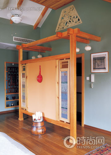 閣樓的改造提供給李慧一個極其實(shí)用的大衣帽間,但主臥大門的位置也因此改變,床的位置回避不了面對大門的局面,因此,李慧設(shè)計(jì)了一面類似于中式建筑中的“影壁”的松木隔擋,不僅解決了實(shí)際問題,同時還具有了中式建筑所講求的迂回含蓄的韻味。
