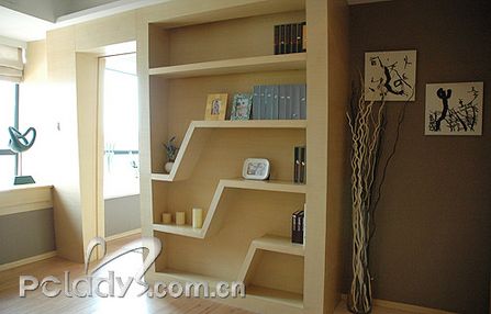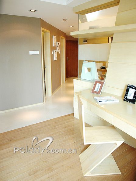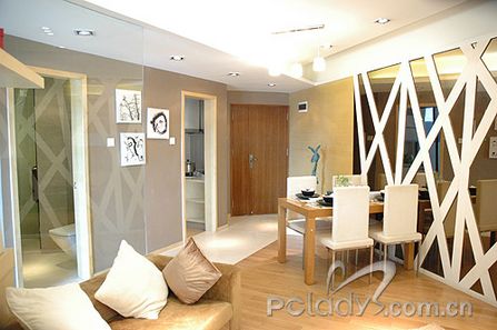 編輯點(diǎn)評:由于這個戶型的整體形狀不規(guī)則,設(shè)計師為了很好地利用空間,使布局更適合用家,將格局進(jìn)行了調(diào)整。以通道貫穿了各個不同空間,同時起到了劃分空間的作用。經(jīng)過調(diào)整,客廳與敞開式的書房構(gòu)成三角形,客廳雖然面積不大,但光線非常充足,還需要用大大的簾子來稍作阻隔。設(shè)計師在這個空間里,充分利用不同材質(zhì)作間隔,劃分空間,又利用很多玻璃、鏡面拓寬空間。間隔客廳和書房的墻體,被巧妙地做成裝飾隔板,上面可以放些主人家喜歡的家居精品,烘托二人的精致世界??蛷d里采用的大多是色調(diào)較淺且線條簡約的家具,打消了空間的沉悶與局限。