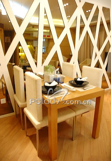 編輯點(diǎn)評:這套樣板間倒沒有開辟出專門的就餐區(qū)域,不過這絲毫不影響設(shè)計師讓餐廳自成一格的想法??蛷d的鏡子墻邊靠著四人座的餐桌,土黃的桌身配著白色的布藝餐椅,桌上精致的餐具很是吸引人。餐桌上還懸著一盞造型別致的吊燈,讓就餐的氛圍顯得其樂融融。