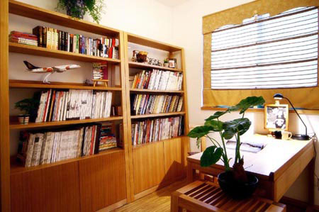 客廳兼做餐廳已經(jīng)非常普遍,因此,你只要在客廳的一角用地臺(tái)和屏風(fēng)簡(jiǎn)單地加以劃分,墻上再做兩層書架,下面做一個(gè)書桌,一個(gè)別致的小書房就出現(xiàn)了。