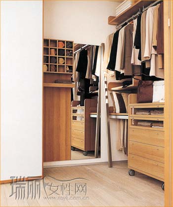 打造更衣室前,要先對其功能做個預(yù)想,并考慮好衣服的分類方法。不足5平米的小儲藏室如要做成步入式更衣室,建議選用“L”形的衣柜;而狹長的儲藏室則適用“一”字形的衣柜。