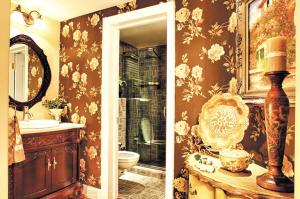 敲開門的瞬間,我們誤以為時空交錯,闖進了哪位歐洲貴族家庭。厚重的實木手工沙發(fā)有著絲絨的質(zhì)感以及流暢的歐式卷草紋,精美的仿真電壁爐與一幅古樸的油畫相呼應(yīng),木制畫框上仿佛還積著一些塵埃和斑駁的金漆。一樓被劃分為會客區(qū)、視聽區(qū)和餐廳,客廳餐廳之間過渡了一池美麗的睡蓮。