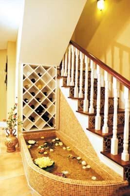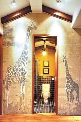 上到三樓,我們的視覺再次受到?jīng)_擊,恍惚以為剛跨越歐亞大陸來到東南亞。通往露臺的一排移門被設(shè)計師改造成一個1米多寬的浪漫飄窗,全部用馬賽克砌成,可以躺下一個成年人。飄窗前的休閑區(qū)和兩間客房是清一色東南亞草編家具。浴室外墻最高處近4米,設(shè)計師用最細小的馬賽克鑲拼了一對長頸鹿,一高一矮和天花板的斜坡正好相映成趣。
