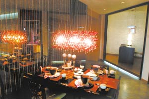 在餐廳的燈和餐具的使用上,特地選擇了白色和大紅色,它們在深色玻璃和黑色餐桌的襯托下更顯絢麗。