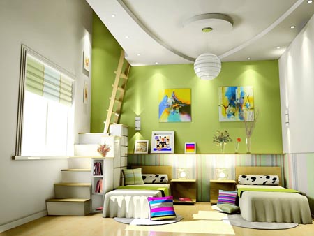 利用視覺感受來改變居室空間印象。有兩種方法:一種是將空間擴(kuò)大,例如將墻面或天花板涂飾成接近天空的淺藍(lán)色,這樣可以產(chǎn)生空間擴(kuò)大的視覺效果。另一種作法是發(fā)揮色彩的功效去創(chuàng)造特定的室內(nèi)氣氛。墻面裝飾可選用色彩強(qiáng)烈的民間工藝品,也可采用抽象的色塊,只要使形和色協(xié)調(diào),就能收到令人滿意的效果。