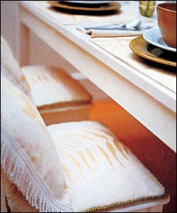 尋常普通的餐椅需要轉(zhuǎn)換感覺,可以用剩余的布料,也可以選擇風(fēng)格相似的壁布來(lái)幫忙。這里風(fēng)格比較簡(jiǎn)約,不適合做椅套。只是給椅子加上一張坐墊,再縫制一張舒服的靠墊,簡(jiǎn)陋的椅子從容變身,富有情趣的用餐場(chǎng)景出現(xiàn)了。