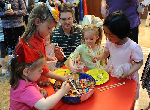 5月30日,在比利時首都布魯塞爾的中國駐歐盟使團,中外兒童在一起學習使用筷子。在“六一”國際兒童節(jié)前夕,中國駐歐盟使團邀請在布魯塞爾的百余名兒童及家長共慶兒童節(jié)。使團組織了中國特色濃郁的演出游藝活動,不僅增進了孩子們之間的友誼,更增加了當?shù)貎和凹议L對中國文化的了解。新華社記者武巍攝