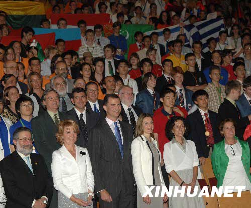 資料圖片:2008年7月21日,西班牙王儲費利佩(前左三)和王妃萊蒂西亞(前左四)等與參加國際數(shù)學奧林匹克競賽的選手合影。