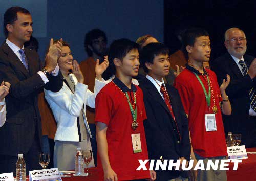 資料圖片:2008年7月21日,西班牙王儲費利佩(后左一)和王妃萊蒂西亞(后左二)等為國際數(shù)學奧林匹克競賽三位滿分獲得者鼓掌,中國隊選手牟曉生(前左一)、韋東奕(前左三)及美國選手阿歷克斯·翟(前左二)是本次比賽的三位滿分獲得者。
