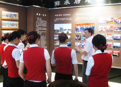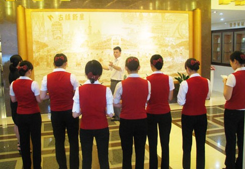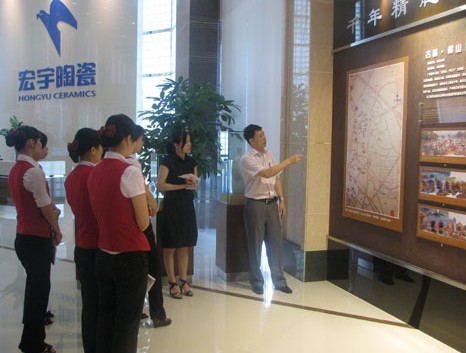 培訓(xùn)第一站是大堂的"古鎮(zhèn)新星"大型金色主題畫,該畫以佛山陶藝史專家霍流芝原作為范本,以宏宇·莎安娜玉石為材料,經(jīng)電腦雕刻而成,畫面古樸高雅,意蘊(yùn)雋永,生動(dòng)再現(xiàn)了佛山石灣古今制陶技術(shù)演變,濃縮古鎮(zhèn)陶業(yè)發(fā)展的滄桑巨變,反映出宏宇陶瓷是在千年陶都中成長(zhǎng)起來的一顆新星。