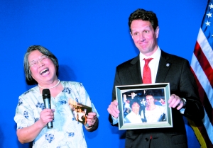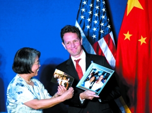 北京大學(xué)中文老師傅民(左)向美國財長蓋特納贈送28年前的合影照時,蓋特納表示驚喜。昨日,蓋特納在北京大學(xué)發(fā)表演講時,用中文呼吁中美“同心協(xié)力”應(yīng)對挑戰(zhàn)。蓋特納1981年曾在北大學(xué)中文,傅民是其當(dāng)年的老師。王天天 攝