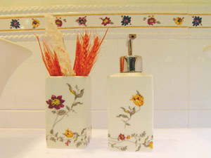 肥皂碟、牙刷杯等洗漱用品可以變成藝術(shù)品?你難以想象。然而,設(shè)計(jì)師就有足夠的想像力將它們演繹成陶瓷藝術(shù)品。肥皂碟呈現(xiàn)一個(gè)小小的扁圓形,有意思的是位于扁圓形中央的圖案設(shè)計(jì)———一張自然攤開的紅楓葉,看上去就像秋天楓樹上不經(jīng)意間落下的一片楓葉,悄悄地在一個(gè)陶瓷小碗上安了家。楓葉的紅,陶瓷制品的晶瑩剔透,兩者融合在一起,確實(shí)給予衛(wèi)生間一種別樣的美感。