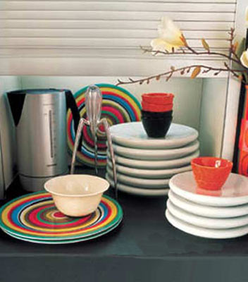 灰白相間的櫥柜在過(guò)節(jié)時(shí)需要增加活躍的氣氛,選擇波普?qǐng)D案和圖樣豐富的美洲部落元素的廚具,對(duì)改變單調(diào)的氣氛非常有效。波普餐盤可以立在水槽邊和墻上的隔板上,再將一些具有民族風(fēng)格的彩色調(diào)料瓶、水果托盤和冰酒桶混搭在波普風(fēng)格之中,立刻組合出極為豐富的色彩和多變的圖案。