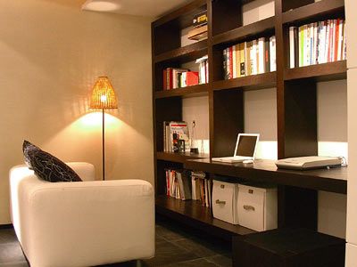 面積充裕的居室中,可以獨(dú)立布置一間書房,面積較小的居室可以辟出一個(gè)區(qū)域作為學(xué)習(xí)和工作的地方,可用書櫥隔斷,也可用柜子、布幔等隔開。