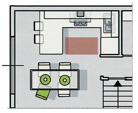 餐廚空間與起居室相連,所以在顏色的使用上要與之保持連貫,但開(kāi)放的空間需要安排一些起伏,讓起居室和餐廚空間的分區(qū)更加明確,也可以給絢麗的環(huán)境增加一些緩沖,讓起居室的亮麗更突出,讓餐廚空間的生活氣息更濃。