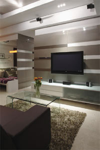 設(shè)計師為公寓客廳選擇線條簡潔的紫褐色沙發(fā),透明的玻璃茶幾。飯廳里特別定做的長凳子,配搭上艷麗的紫紅色坐墊,叫飯廳亮麗起來。