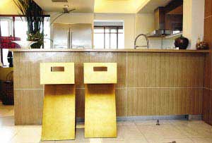 在一個(gè)面積并不是太大的廚房里設(shè)置一個(gè)“大塊頭”吧臺,還是不規(guī)則的形狀,目的何在?原來奧秘就在于業(yè)主的需要。由于居住者是一個(gè)外國人,愛好結(jié)交朋友的他喜歡邀請朋友來家里吃飯和聚會。在外國人的觀念里,給朋友做飯是件幸福的事情,于是在廚房里根據(jù)廚房的形狀定制了一個(gè)吧臺,自己做飯時(shí),朋友能夠坐在這里來杯咖啡,并和自己聊天。