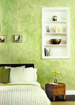 概要: 涂料:百色熊內(nèi)墻柔潤絲光涂料、百色熊特種釉感裝飾涂料 工具:抹布、9.53毫米滾刷、一桶清水、手套、護(hù)地罩單等 ?。模桑俜椒ǎ耗ú纪克⒁灿袃煞N方法。這里給大家介紹的是布涂脫色法。1、先從頂部墻角開始,用滾刷將釉感裝飾涂料刷在90厘米×90厘米的墻面部塊上;2、用干凈濕抹布沿墻面隨意地輕拍或者滾動(dòng)以蘸掉部分未干的涂料,形成不規(guī)則的花紋。