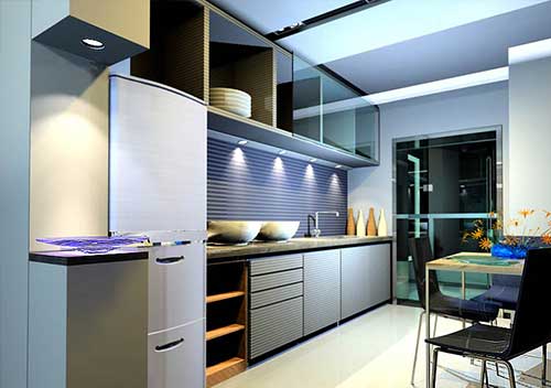 廚房里的矮柜最好做成抽屜、推拉式以方便取放,視覺(jué)較高比較好,而吊柜一般做成30-40厘米寬的多層格子,柜門(mén)做成對(duì)開(kāi),或者折疊拉門(mén)形式。