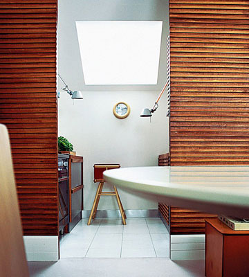 半開放的廚房空間讓從斜屋頂窗射入的光線更充分地補充到餐廳空間。