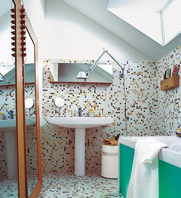 色彩在戈文家中的應(yīng)用不只局限在室內(nèi)的裝飾品上,令人意想不到的驚喜竟然隱藏在浴室中。8平米的浴室空間整體用白色和咖啡色系的馬賽克包裹,并且與浴缸側(cè)面的熒綠色形成對比,使整個浴室跳躍起來。在起居空間作為主角的原木材料在這里成為了配角,框起兩面落地的大鏡子。略加傾斜的鏡面又一次在視覺上擴大了這個獨立空間,其實用性也有所體現(xiàn)。