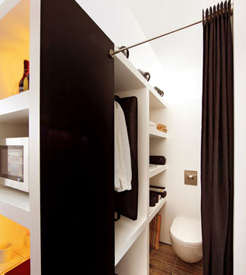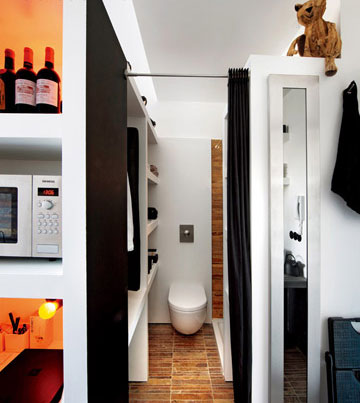 貫穿房間長度的桌板承擔了豐富的功能,靠近門口的位置是廚房,配置有水槽、備餐空間以及灶臺。往里,就是任人發(fā)揮的多功能區(qū),在這里,吃飯、工作都可以進行。桌板下面的隔板,不僅起到支撐作用,同時自然劃分了功能區(qū)。兩個可折疊的茶幾和帶輪子的沙發(fā)凳活躍在桌板周圍,神奇地轉(zhuǎn)換著起居空間的功能。白天,沙發(fā)凳藏在桌板下面,晚上,并排在一起就能變成雙人床。擱架上擺放的物品也隨著桌板的角色而改變,從調(diào)料瓶、廚房設備,到書籍和藝術作品,這是安東最得意的地方,他的喜好、品位以及生活所需,全部得以展示。轉(zhuǎn)回去看看那個神奇的盒子,洗浴和馬桶的空間被一再縮小,更多的位置留給物品儲藏。衛(wèi)浴間沒有使用傳統(tǒng)意義上的門,而是掛了一個厚厚的布簾,省去了開關門所需的空間。擱架也根據(jù)空間功能而劃分為幾個部分,面對衛(wèi)浴間的用來放衣物,而朝向桌板的一面則把微波爐、咖啡機全部收起來。