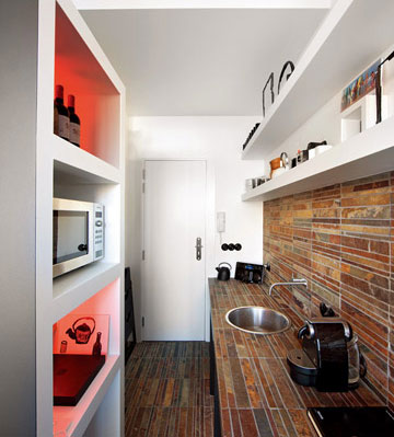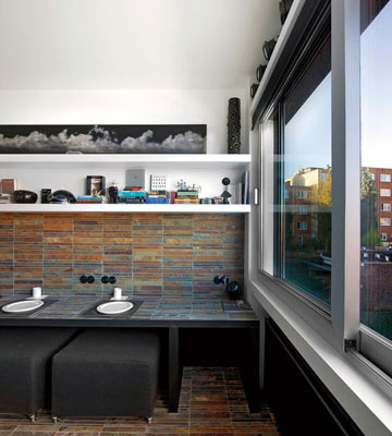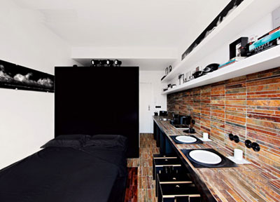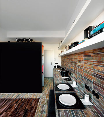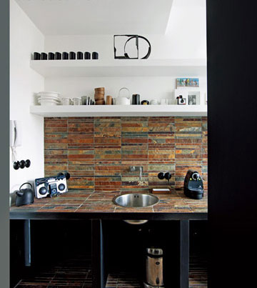 為了達到視覺上的平衡和統(tǒng)一,安東在整個房間中只使用了一種裝飾材料——來自印度的頁巖。桌板上、擱架到桌面之間的墻圍以及整個地板全部使用了這種材料。因為天然石材所擁有的不規(guī)則花紋以及自然的色彩變化,即使大面積使用,也不會感覺沉重。同時,長方形的磚體規(guī)格更增強了房間的縱深感,讓小空間也顯得落落大方。黑白兩色的墻壁與頁巖花紋形成呼應,拼貼風格的牛皮地毯更是點睛之筆,大膽出位的色彩和材質(zhì)應用,成功營造了空間感。