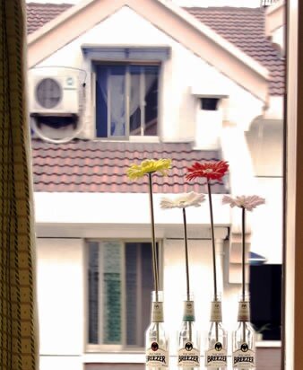 窗前,沒有過多的裝飾,連窗套,也是簡單的一塊板,再刷上一層白漆。插花的瓶子是上回和朋友K歌時(shí),喝剩下的,覺得還漂亮,就帶回了家。四朵色彩太陽花,將白晝所有的喧嘩浮土都埋藏其中。不管窗外春夏秋冬,一切都是自然隨意的。