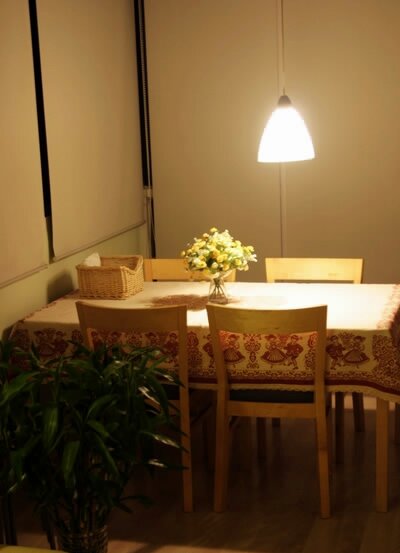 四人的餐桌。黃白色的雛菊,安靜的插在透明玻璃瓶里。一盞黃色的燈泡,外面乳白色的燈罩,吊在一根干脆的電線上。都不寂寞。