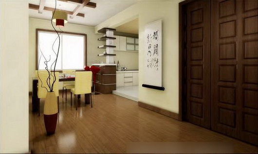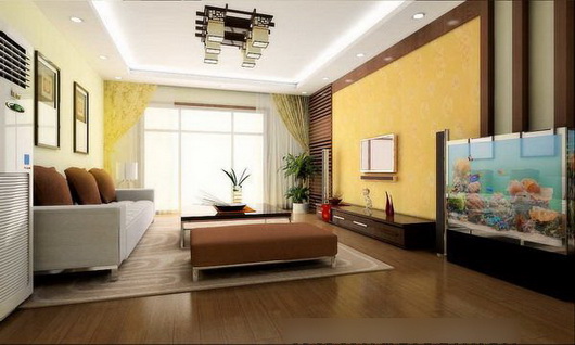客廳的處理采用了大氣的回廊型吊頂,電視墻采用中式古典的立柱,以及具有中國(guó)傳統(tǒng)文化氣息的“印章”(壁紙)處理方式,再加上中式吊頂和胡桃木色的地板,簡(jiǎn)約中略帶中國(guó)風(fēng);整個(gè)客廳的亮點(diǎn)是立柱下的魚缸,它擺放的位置正好是整個(gè)居室的“財(cái)位”,不僅在風(fēng)水設(shè)計(jì)中體現(xiàn)中式元素,也給空間增添了生氣。