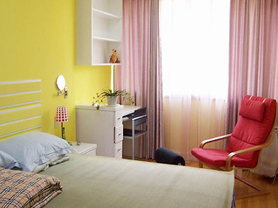 無疑,臥室中最主要的家具應(yīng)該是床,但衣柜的地位也很重要。我選擇了一組實櫸木的衣柜,有三個大抽屜,里面可以放衣服和其它日用品,抽屜上面的開放空間可以方便的放置許多物品,電視置于其中,充分地利用了空間。磨砂玻璃柜門,其質(zhì)感使室內(nèi)顯得明亮開闊。