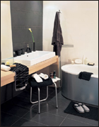 黑色酷而時髦,是經(jīng)典的風(fēng)格。用黑色給都市男人定性是約定俗成的。所以為他們打造的浴室也自然是黑色的。從洗漱套件到地毯、熏香燈都一絲不差地選用黑色,連男士專用的香水沐浴露都是用黑色來包裝的。如果覺得色彩太單一的話,可以用白色、灰色來調(diào)劑一下,就算是一枝簡單的馬蹄蓮也可以起到特別的效果。