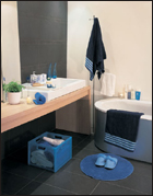 天空、海洋的蔚藍(lán)色可以讓人感到心情舒爽,很適合在炎熱的季節(jié)里表現(xiàn)出來。藍(lán)色系東西挑選余地很大,因為質(zhì)地的不同而折射出深淺不一的色彩。玻璃、塑料等透明的家居用品最適合設(shè)計成藍(lán)色,在燈光的照射下十分漂亮。藍(lán)色基調(diào)的浴室能讓你的疲憊在沐浴中流逝,和天一色,和海一色,真是件愜意的事情。