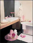 既然黑色給了office里的帥哥,那粉紅就很自然地留給女人。嬌艷的色彩讓人見了就心生愛意。粉紅蕾絲的紙巾盒、化妝包,綴著花朵的拖鞋把女人的柔媚之情表露無疑。在這樣的浴室里所有的裝飾品都被染上了這種顏色,玫瑰、香精當(dāng)然是不能少了。這個城市的性格太冷硬,在浴室里還是讓女人還原一下吧!