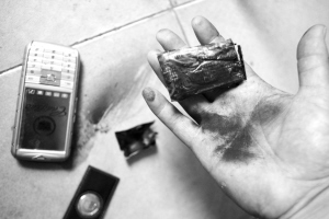爆炸手機電池里的黑色粉末留在張先生手里 記者 周凡力 攝