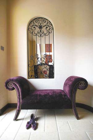 然而重點是鞋凳,紫色的絲絨面料讓人覺得溫暖并且與眾不同,仿古的造型和流線型的線條讓人感受到女性的柔情和嫵媚,女主人的紫色高跟鞋擺在凳子前,仿佛正訴說著屋內(nèi)的秋光。當(dāng)然,還有鏤空鐵藝后的客廳空間里遠(yuǎn)遠(yuǎn)的一抹暗紅,都顯示出低調(diào)中的華麗感覺。