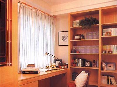 面積充裕的居室中,可以獨(dú)立布置一間書房,面積較小的居室可以辟出一個(gè)區(qū)域作為學(xué)習(xí)和工作的地方,可用書櫥隔斷,也可用柜子、布幔等隔開。