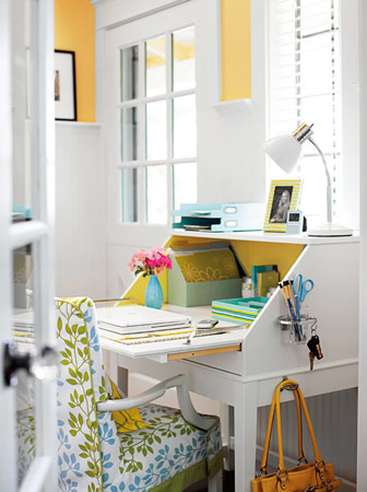 聰明女人的辦公桌一定是整齊而多功能的,這里可以掛起你的錢包或者公文包,處理電子郵件,把第二天要帶去公司的文件擱在這里,出門的時(shí)候也一定不會(huì)忘記。頂層的文件盒也是最明顯的地方,裝一些你想看得見、記得帶的東西,比如需要郵寄的信件。下面的文件夾裝一些經(jīng)常處理的文件,比如賬單。桌面上的托盤盒裝手機(jī)、ipod等小物件,盒子外圍可以用絲帶稍微點(diǎn)綴一下。桌子側(cè)翼用來(lái)放筆的牙缸架和掛鑰匙的S形鐵鉤功不可沒,而桌邊掛衣鉤的出現(xiàn)讓手包和公文包在使用時(shí)垂手可得。