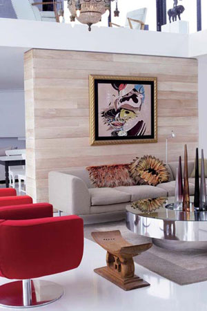 成功在于細(xì)節(jié)。Julian和Trevyn把他們“回歸自然”的設(shè)計(jì)理念貫徹到了每個角落,他們盡可能地使用自然材質(zhì)裝飾空間:在室外種植的幾盆綠意盎然的大型盆栽,和室內(nèi)桌上擺著的一捧捧白色馬蹄蓮相映成趣。最醒目的當(dāng)屬那個吊在門口形狀妖嬈的羊角,而室內(nèi)沙發(fā)旁邊兩個敦實(shí)可愛的純天然圓石充當(dāng)?shù)淖?,不得不讓人嘆為神來之筆。除此之外,用純木制的墻板來間隔室內(nèi)空間,加上比比皆是的原色原木家具,比如墻角處厚重感十足的木制躺椅,還有以一個方方正正的木墩完成的小茶幾,無一不閃爍著“貼近自然、回歸自然”的純樸思想。
