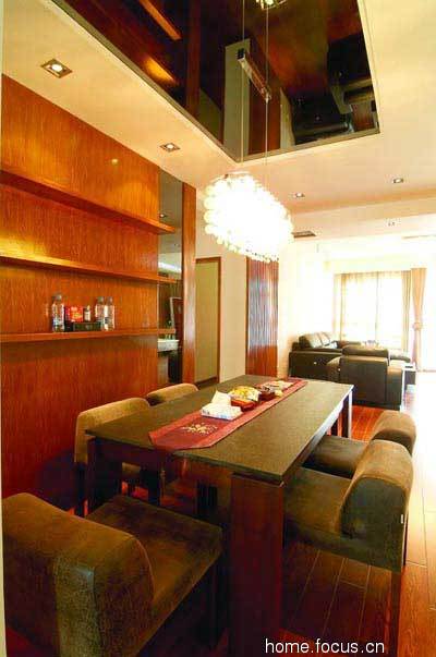 這個(gè)空間以黑、灰、米、白四色為基調(diào)。以現(xiàn)代、典雅、復(fù)古為主題,通過帶有古典韻味的屏風(fēng),把客廳巧妙地分隔成玄關(guān)和會客廳兩個(gè)實(shí)用空間,大面積的木制墻飾也巧妙地把兩者收納在一個(gè)大的空間內(nèi)。且大面積的灰鏡和帶有復(fù)古氣息的木墻飾也使客廳在穩(wěn)重之外多了一些華麗優(yōu)雅的現(xiàn)代感。木制電視墻將電視線路與視聽器全都收納其中,將雜亂無章化為無形,也是簡約的一種體現(xiàn)。